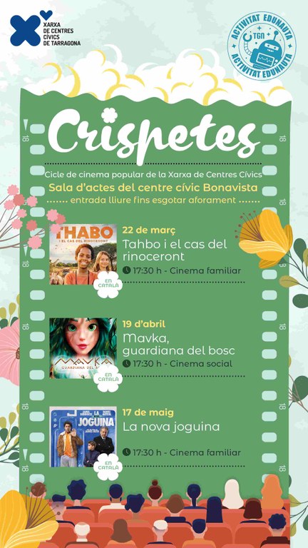 Divendres comença la tercera edició del cicle de cinema familiar Crispetes amb la projecció de la pel·lícula Tahbo i el cas del rinoceront, on el desig de ser detectiu del jove Tahbo, es farà realitat per investigar el brusc assassinat d’un rinoceront en un parc natural, a les 17:30 h a la sala d’actes del Centre Cívic Bonavista, l’antic cinema Miralbó. En el marc d’aquest cicle, el 19 d’abril es podrà veure Mavka, guardiana del bosc, en un món fantàstic i encantat la presència humana farà enfrontar entre l’amor i el seu deure a la Mavka, la seva guardiana i, el 17 de maig, La nova joguina, d’entre tot un magatzem de joguines, el nen escull el vigilant nocturn i així és com viurà aventures d’allò més inesperades. Les tres pel·lícules són per a públic familiar i en català, la novetat en aquesta edició és l’horari, que passa del dissabte al matí a fer-ho a divendres a la tarda.
