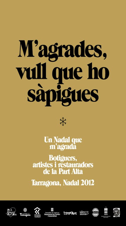 Es tracta de fomentar de manera creativa el flux de vianants durant l’ horari comercial. Per això es provoca un ambient agradable al carrer que consolidi la marca Part Alta, com un barri atractiu i polivalent, on s’hi pot fer una agradable passejada i gaudir d’ofertes cultural, gastronòmiques i comercials. És una campanya dirigida tant als residents de la Part Alta, com als ciutadans de Tarragona i visitants. Aquesta activitat començarà el 12 de desembre i finalitzarà el 12 de gener. “La dinamització del PIPA, passa per la complicitat entre col·lectius d’artistes, restauradors i teixit comercial, per tal de fomentar l’ interès de les famílies pel barri durant aquestes festes ” ha dit la consellera de Comerç i turisme Patrícia Anton.
