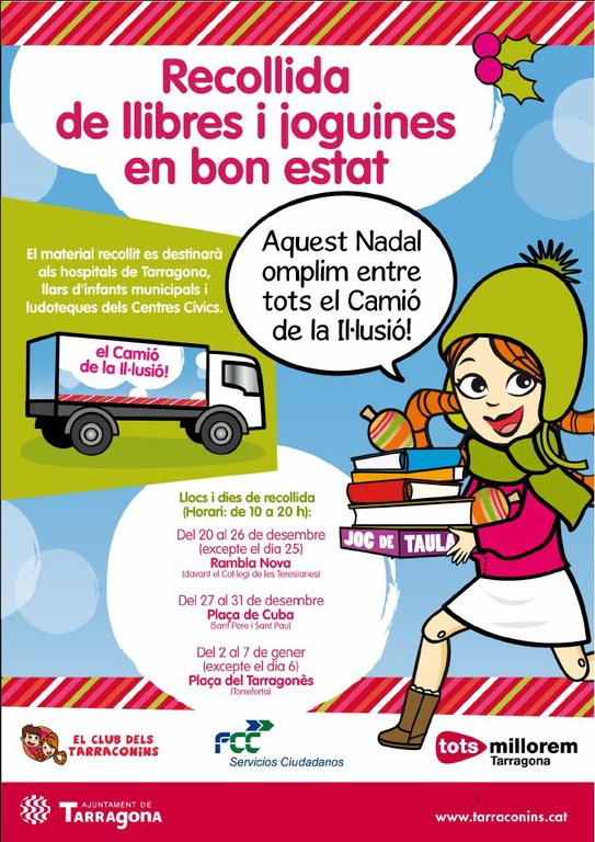 Dilluns al matí la tinenta d’alcalde de Comunicació i Participació, Begoña Floria, i el conseller d’Espais Públics, Antonio Rodríguez, donaran el tret de sortida a la campanya de recollida de llibres i joguines en bon estat impulsada pel Club dels Tarraconins i l’empresa de Foment de Construcciones i Contratas (FCC). Des d’aquest dilluns dia 20 i fins al dia 7 de gener, les joguines i llibres es podran deixar al Camió de la Il·lusió, que realitzarà un itinerari per diferents punts de la ciutat. El material recollit es destinarà als hospitals de Tarragona, llars d’infants municipals i ludoteques dels Centres Cívics.