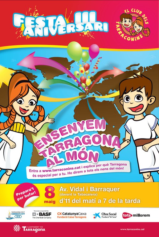 La festa del tercer aniversari del Club dels Tarraconins se celebra el proper diumenge 8 de maig, d’11 a 19 hores, a l’avinguda Vidal i Barraquer (davant la Tabacalera) amb un gran espectacle central i 22 espais amb diferents jocs i tallers, el doble que l’any passat. Una de les novetats d’enguany és que la festa s’allarga matí i tarda.