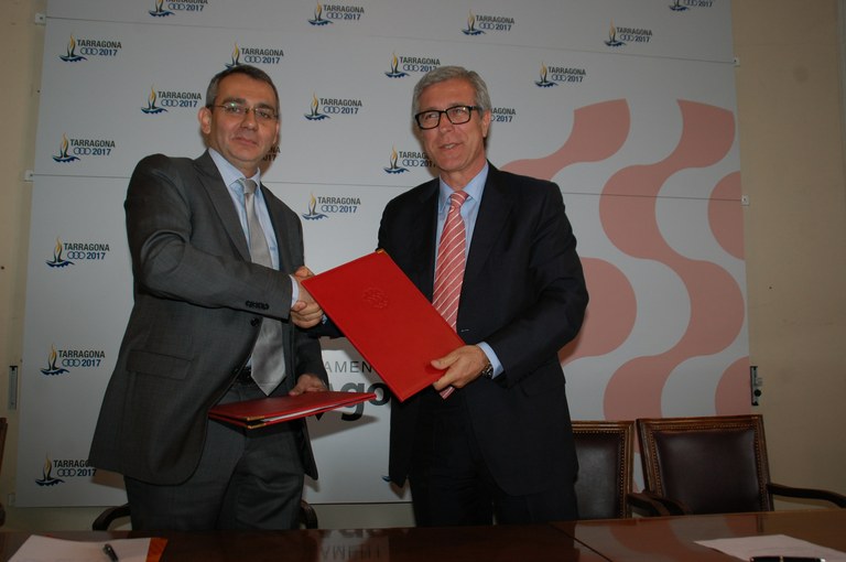 L’alcalde de Tarragona, Josep Fèlix Ballesteros, i el director d’Agbar Catalunya, Albert Martínez Lacambra, han signat aquest migdia un conveni marc amb Aigües de Barcelona amb l’objectiu de fer més evident el compromís de l’empresa en les iniciatives de la ciutat.