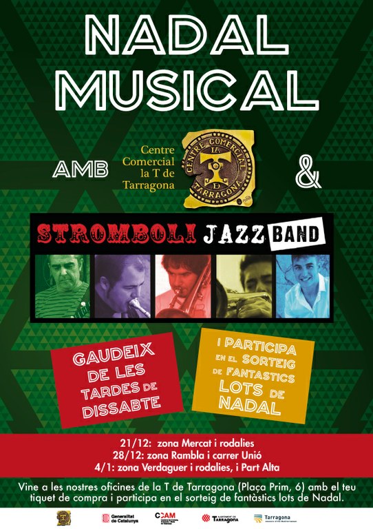 El Centre comercial la T de Tarragona i Stromboli Jazz Band oferiran tardes musicals pels dissabtes de Nadal, a partir del pròxim 21 de desembre. El concert itinerant es farà a la tarda de 18 a 20.30 h i els Stromboli aniran passejant pels carrers de les diferents zones comercials.