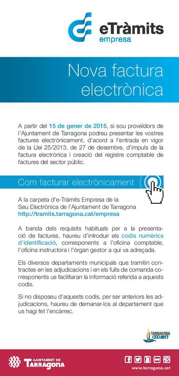 A partir d’avui entra en vigor la Llei 25/2013, de 27 de desembre, d’impuls de la factura electrònica i creació del registre comptable de factures del sector públic. Per tant, a partir d’avui tots els proveïdors de l’Ajuntament que ho vulguin podran expedir i remetre factures en format electrònic.