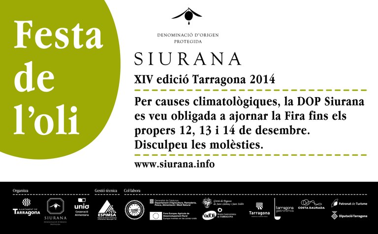 A causa de les males previsions meteorològiques, els organitzadors de la Festa de l'Oli de la Denominació d'Origen Protegida Siurana (DOP Siurana) i l'Ajuntament de Tarragona han decidit postposar la fira prevista per aquest cap de setmana als propers dies 12, 13 i 14 de desembre. La Mostra Gastronòmica de l'Oli Va d'oli que té lloc a diferents restaurants de la ciutat sí que es manté des d'ahir, 27 de novembre, fins al 8 de desembre.