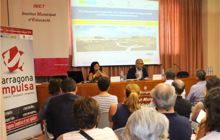 Aquest dimecres al matí ha tingut lloc una presentació tècnica del Pla d'Acció del Llegat dels Jocs Mediterranis Tarragona 2018 davant de regidors i tècnics dels municipis seu de la competició i representants del teixit esportiu i empresarial del territori. La sessió ha tingut lloc a la sala d'actes de l'Institut Municipal d'Educació (IMET) i ha estat inaugurada pel conseller d'Ocupació i Desenvolupament Econòmic, Francesc Roca, i tancada pel conseller comissionat dels Jocs Mediterranis, Javier Villamayor.