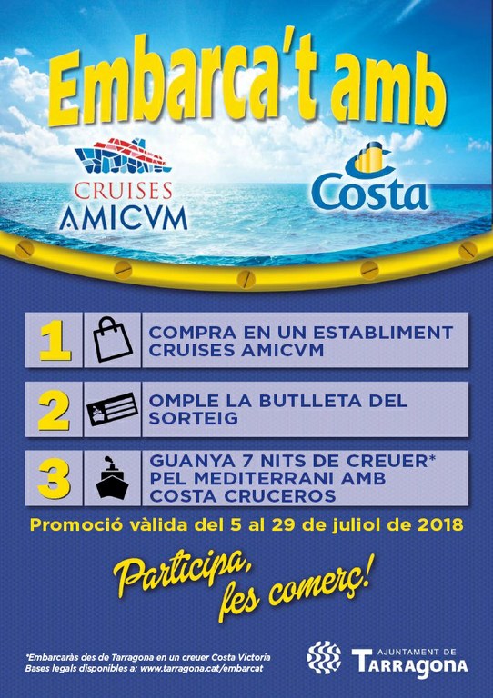 La conselleria de Comerç de l’Ajuntament de Tarragona impulsa la campanya “Embarca't amb Cruises Amicvm i Costa Cruceros!” que pretén dinamitzar el comerç i la restauració del centre de Tarragona i alhora relacionar el turisme de creuers amb els operadors de Crusies Amicvm. La campanya es durà a terme del 5 al 29 de juliol als establiments integrants a la Zona d’Acolliment de Creueristes de Tarragona.