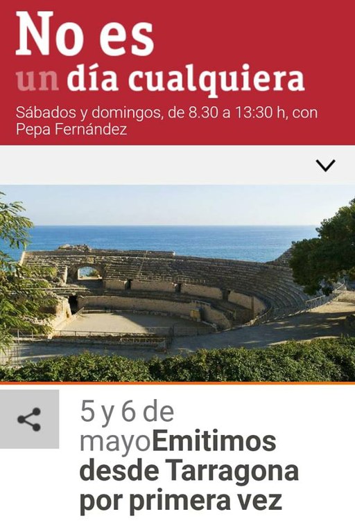 El programa radiofònic de RNE 'No es un día cualquiera', conduït per Pepa Fernández, es realitzarà en directe durant el pròxim cap de setmana des de Tarragona. La sala d'actes de l'Antiga Audiència es convertirà en l'estudi radiofònic del programa els matins de dissabte i diumenge a partir de les 8.30 h i fins a les 13.30 h, i estarà obert a tota la ciutadania que vulgui assistir-hi com a públic. La visita, la primera a la ciutat en els 19 anys d'existència del programa, ha estat promoguda pel Patronat Municipal de Turisme de Tarragona. La presidenta, Inma Rodríguez, s'ha mostrat especialment satisfeta per aquesta fita, que considera "una oportunitat excepcional de promoció acollir aquest reconegut programa viatger en el qual la cultura, la gastronomia i el turisme tenen un paper protagonista. Aquesta acció ens permetrà fer arribar els atractius i esdeveniments de Tarragona a 850.000 oients en un moment d'especial vitalitat i importància per a la nostra ciutat".