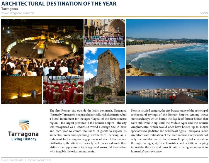 Tarragona, segons ha comunicat la prestigiosa guia de viatges Luxury Travel Guide al Patronat Municipal de Turisme, ha estat distingida enguany com a Destinació Arquitectònica de l'Any als European Awards 2018, en reconeixement al seu patrimoni romà, declarat Patrimoni Mundial per la UNESCO l'any 2000. La publicació ha valorat que Tarragona representa "no només l'arquitectura de l'Imperi Romà, sinó la civilització a través de les èpoques" que l'han convertit en un "monument viu de la perseverança de la humanitat".