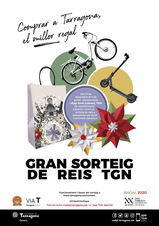 La Conselleria de Comerç de l’Ajuntament de Tarragona, en col·laboració amb l’Associació de Comerciants Via T Tarragona-Shopping, organitza el Gran Sorteig de Reis. Del 28 de desembre al 5 de gener, totes les persones que facin compres a qualsevol dels establiments adherits a l’app Som Comerç TGN que participin a la campanya podran participar al sorteig d’un dels 24 vals de compra per valor de 250 €, 800 € i 1.000 €, IVA inclòs, per a l’adquisició de vehicles de mobilitat personal (VMP) sostenible. El sorteig es realitzarà el dijous 7 de gener a les 10 del matí. La consellera María José López ha volgut destacar: "L’objectiu final del Gran Sorteig de Reis és impulsar les compres d’aquestes festes al comerç de proximitat i que d’aquesta manera pugui fer front a les conseqüències econòmiques de la pandèmia. A més, ho fem potenciant la mobilitat sostenible a la ciutat".