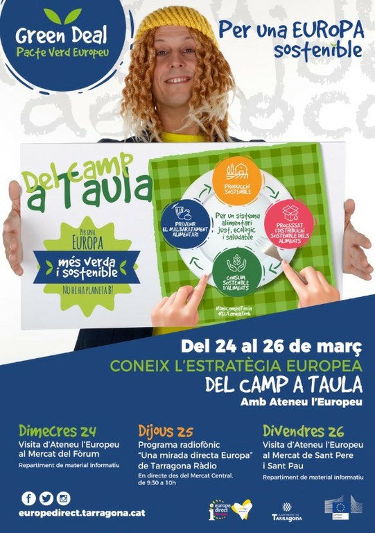 L’Ajuntament de Tarragona a través del Centre Europe Direct Tarragona (EDTGN) apropa aquesta setmana el Pacte Verd Europeu (també conegut com a Green Deal) als ciutadans de Tarragona, amb una campanya informativa als mercats municipals. Així, a partir de dimecres, i fins divendres, Ateneu l’Europeu visitarà el Mercat del Fòrum, el Mercat Central i el de Sant Pere i Sant Pau per explicar de primera mà quin és el full de ruta de la Unió Europea per una economia sostenible. A més, dijous al matí, a les 9:30h, a Tarragona Ràdio l’espai Una mirada a Europa, es farà en directe des de les instal·lacions de la plaça Corsini i es parlarà de productes de proximitat i d’empreses que han tirat endavant el seus projectes amb fons europeus.