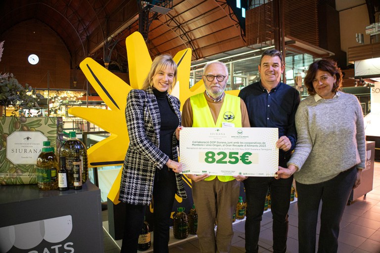Un any més, el Mercat Central de Tarragona ha acollit l’acte d’entrega de la donació solidària de la passada edició de la Fira de l’Oli nou DOP Siurana, celebrada a la plaça Corsini de Tarragona el dies 24 i 25 de novembre de 2023. Es tracta d’un xec de 825 € recollits gràcies al vermut solidari del dissabte de la Fira i de més de 50 litres d’oli d’oliva verge extra. Tots ells han estat lliurats al Banc d’Aliments.