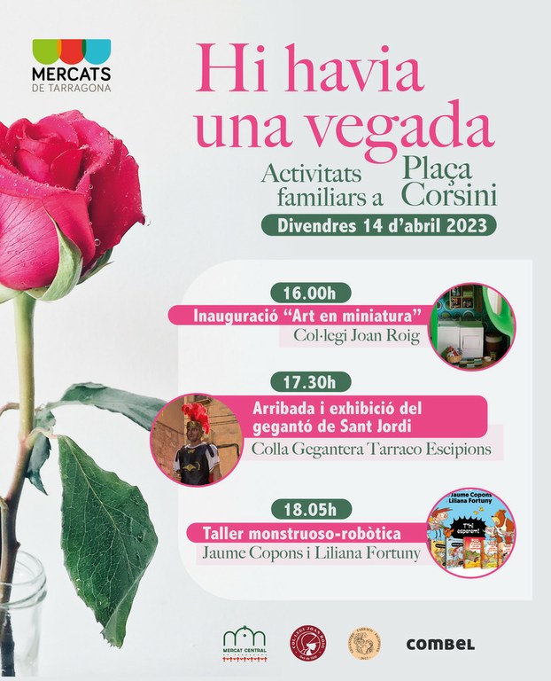 A les 17.30 h la plaça Corsini acollirà l’arribada del Gegantó de Sant Jordi. Un any més, els Geganters Tarraco Escipions seran els encarregats d’apropar al mercat aquest tradicional gegantó, qui farà un ball a plaça i també quedarà exposat a l’interior al Mercat fins el proper cap de setmana, Diada de Sant Jordi.