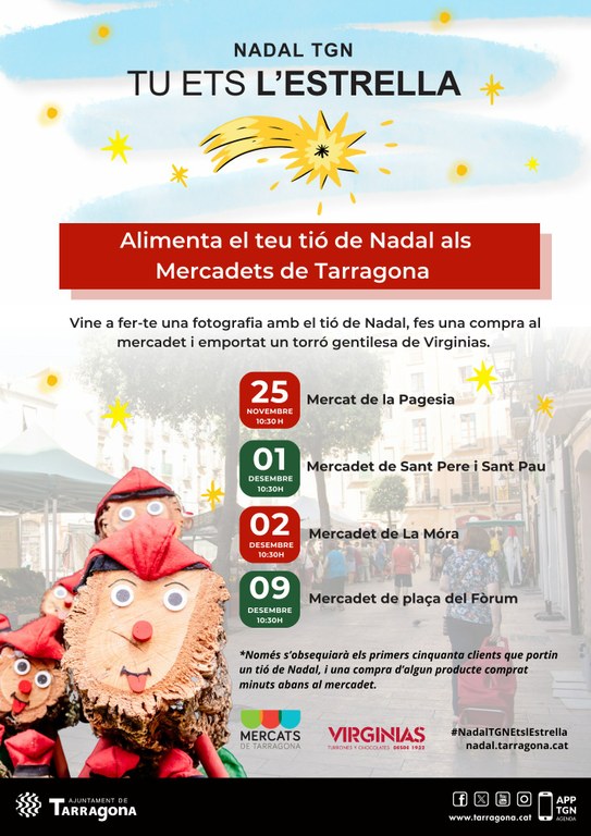 En el marc de les festes nadalenques i per primera vegada, l’empresa Mercats de Tarragona proposa l’acció de dinamització ‘Alimenta el teu tió de Nadal als Mercadets de Tarragona’. És una iniciativa que convida a la ciutadania a visitar alguns dels mercadets de la ciutat amb el tió de Nadal, comprar productes locals i de proximitat i, gràcies a la col·laboració amb l’empresa Virginias, Torrons i Xocolates des de 1932, s’obsequiarà amb un torró als primers cinquanta clients.