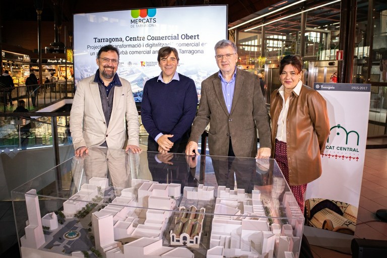 L’alcalde de Tarragona, Pau Ricomà, i el president de l’empresa de Mercats de Tarragona i conseller de Comerç de l’Ajuntament de Tarragona, Dídac Nadal, acompanyats pel gerent de l’empresa de Mercats, Daniel Milà, i la directora dels mercats públics, Mònica Garcia, han presentat avui al Mercat Central el projecte Tarragona, Centre Comercial Obert. Projecte de transformació i digitalització comercial en un nou espai urbà comercial ampliat de Tarragona, el qual ha rebut la concessió definitiva d’un fons Next GenerationEU en el marc de les ajudes a mercats, zones urbanes comercials, comerç no sedentari i canals de comercialització del Pla de Recuperació i Resiliència.