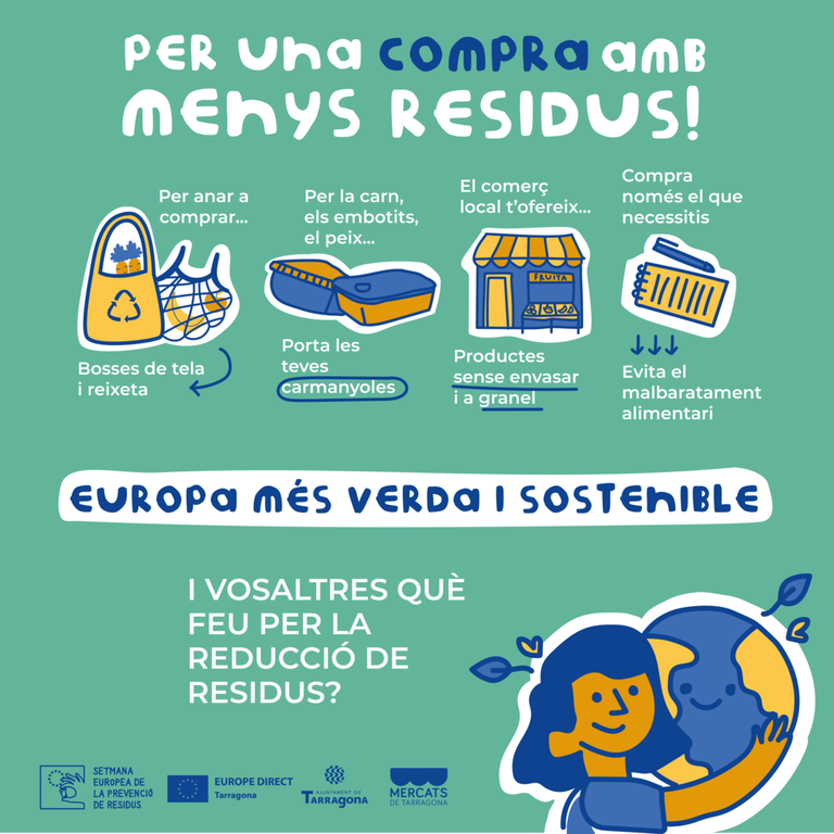 Del 18 de al 26 de novembre, Tarragona se suma a la Setmana Europea de la Prevenció de Residus a través de l’oficina d’Europe Direct a la ciutat. L'objectiu d’aquesta setmana és organitzar arreu d'Europa accions de sensibilització sobre la prevenció de residus.