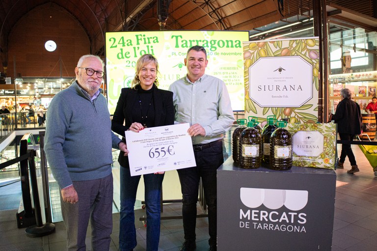 La presidenta Montse Adan ha volgut posar en valor el caràcter solidari de la Fira de l’Oli DOP Siurana, “una cita consolidada a la ciutat amb qui des dels Mercats de Tarragona col·laborem des de fa anys. Confiem que per molts de temps es pugui repetir aquesta donació solidària i tan necessària al Banc dels Aliments de les nostres comarques”.