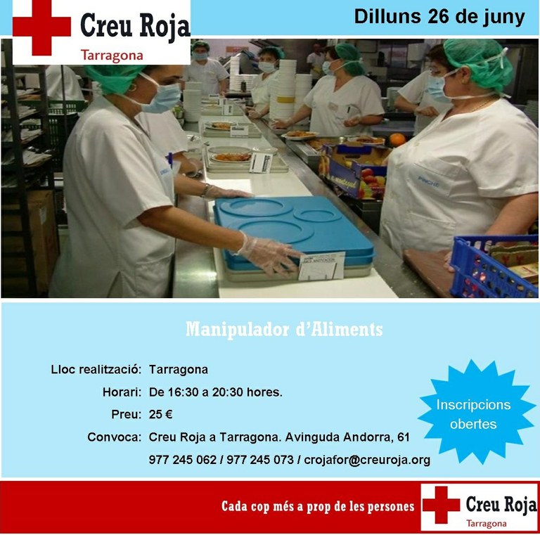 Creu Roja és l'entitat que organitza el curs, que té un cost de 25 €. Per inscriure-s'h podeu trucar al 977 245 062 o 977 245 073 o bé escriure un correu a crojafor@creuroja.org.
