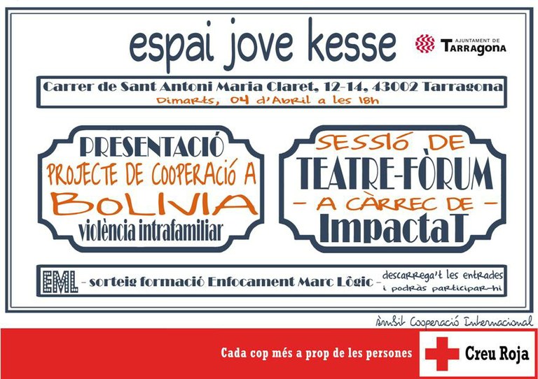 Demà dimarts, 4 d'abril, Creu Roja, Creu Roja presenta el Projecte de Cooperació Internacional: "Dones emprenedores fomenten viure en un ambient lliure de violència al Districte 8 de la Ciudadela Andrés Ibáñez a Santa Cruz, Bolívia" sobre dones i violència intrafamiliar.