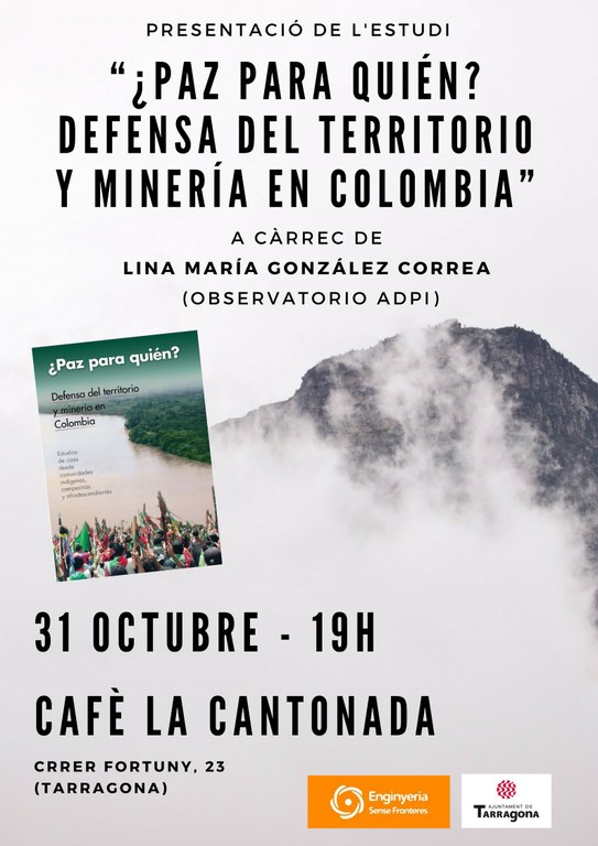 L'entitat presenta dimarts 31 d'octubre, a les 19:00h. al cafè La Cantonada, l'estudi ¿Paz para quién? Defensa del territorio y minería en Colombia.