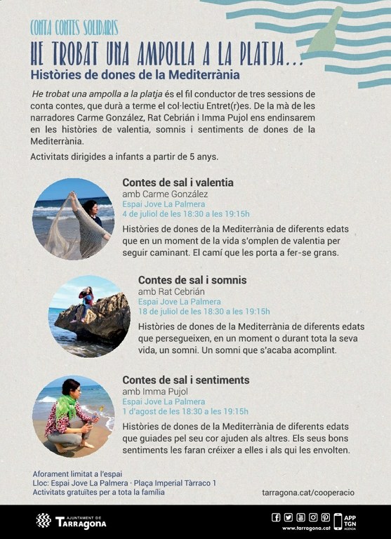 He trobat una ampolla a la platja és el fil conductor de tres sessions de contes en què les narradores Carme González, Rat Cebrián i Imma Pujol endinsaran el públic en les històries de valentia, somnis i sentiments de dones de la Mediterrània. El cicle s'enmmarca dins de Estiu amb CooperAcció, la programació d'activitats d'estiu del Departament de Cooperació.