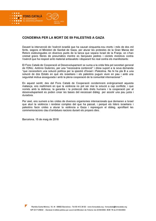 Per això, ens sumem a les crides de diversos organismes internacionals que demanen a Israel que aturi la violència i rendeixi comptes del que ha passat, i perquè els líders israelians i palestins facin crides a aturar la violència a Gaza i reprenguin el diàleg, aprofitant les commemoracions clau d’ambdues nacions durant els propers dies.'
