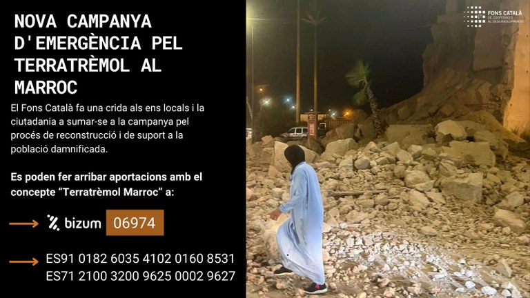 El Fons Català de Cooperació ha obert un compte bancari i un bizum al servei de la ciutadania que vulgui fer aportacions individuals. El Bizum és 06974 i cal afegir el concepte: Terratrèmol Marroc; i el compte bancari és el ES91 0182 6035 4102 0160 8531. Es prioritzen les aportacions econòmiques i es desaconsella la recollida i enviament de materials, ja que en aquest últim cas l’ajut triga massa a arribar i es perd l’oportunitat de ser útil, el cost econòmic i ambiental són elevats; i el transport de material cap a la regió està sent molt difícil.