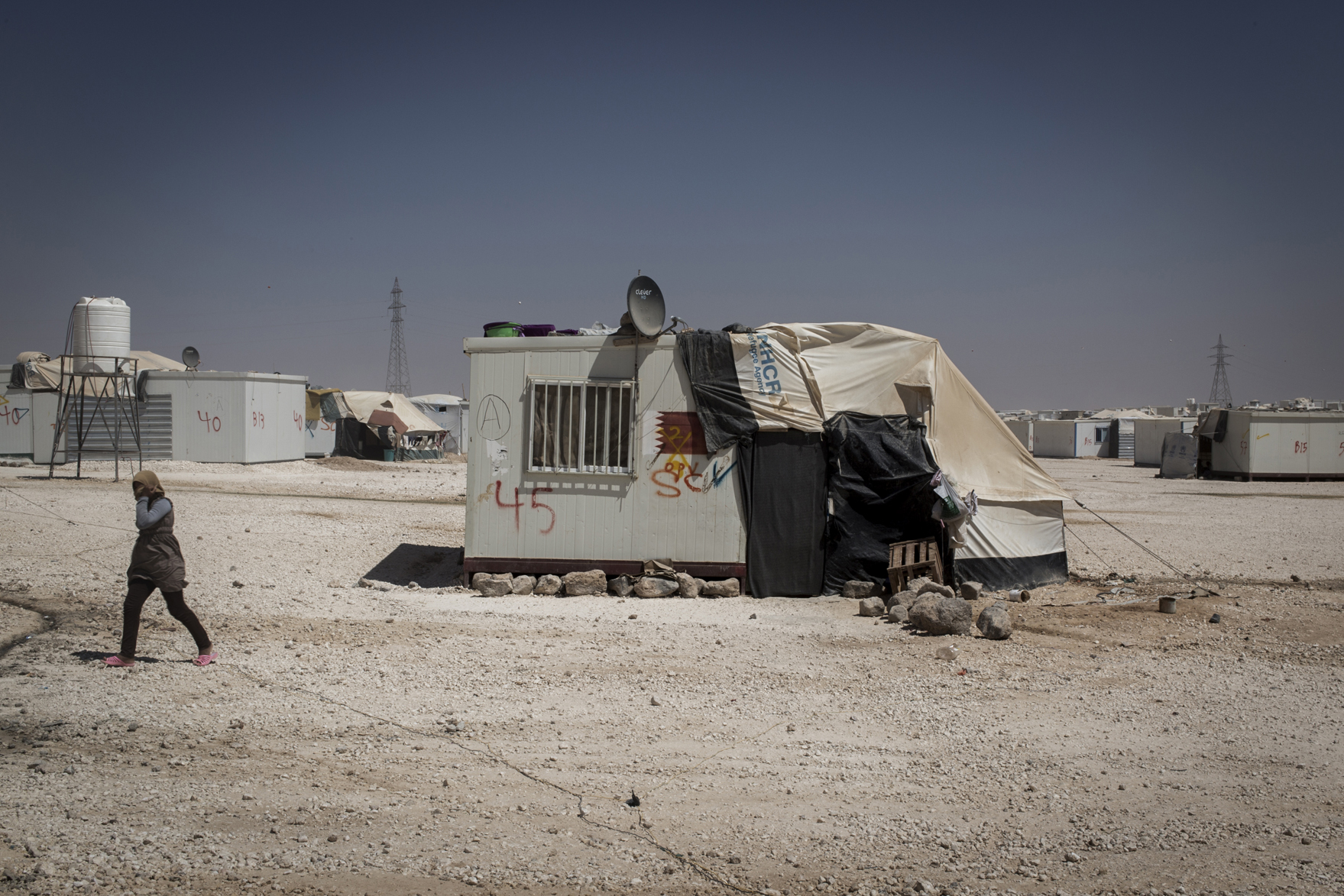 Una noia surt d’un dels barracons per a refugiats habilitats al campament de Zaatari. Quan les famílies arriben al camp se’ls assigna una tenda; i quan fa un temps que hi són, entren en una llista d’espera per aconseguir un barracó. Campament refugiats Zaatari, districte de Mafraq, Jordània, Agost 2014. © David González