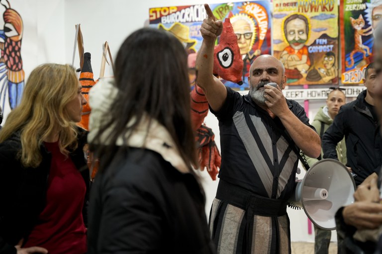 Marcel·lí Antúnez, amb megàfon inclòs, proposa una entrada directa a l’exposició “Llum, Natura Centrum Est”: una visita des de dins del projecte, des de les històries i els processos que han anat donant forma a aquest campament instal·lat al Tinglado 2 i saber més de Llum de la Selva, pagès naturista que va viure entre Barcelona, Sabadell i la Galera, a qui Antúnez ret homenatge.