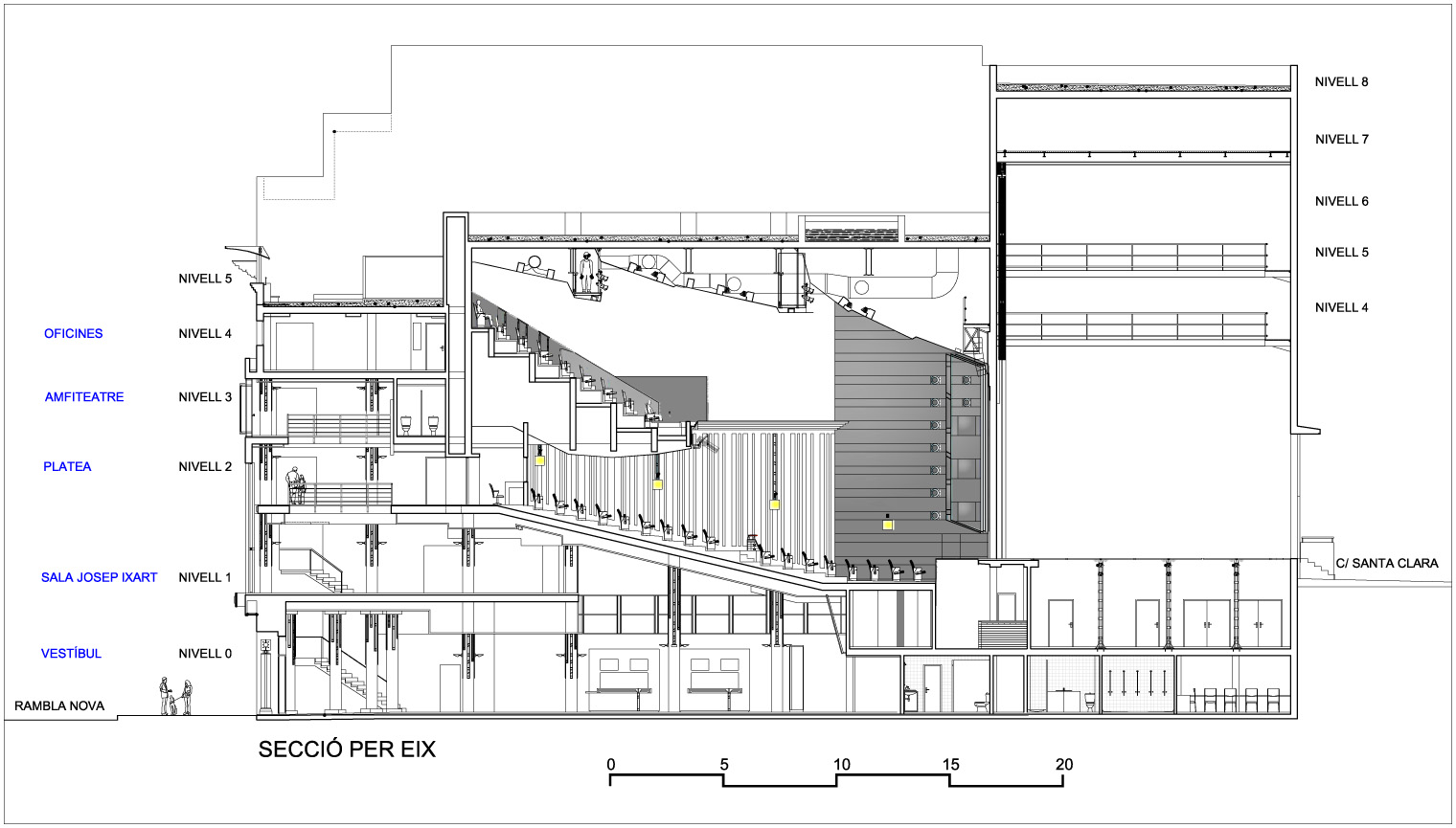 • Accessibilitat: tres escales dedicades al públic, dues d’elles fins a l’amfiteatre.