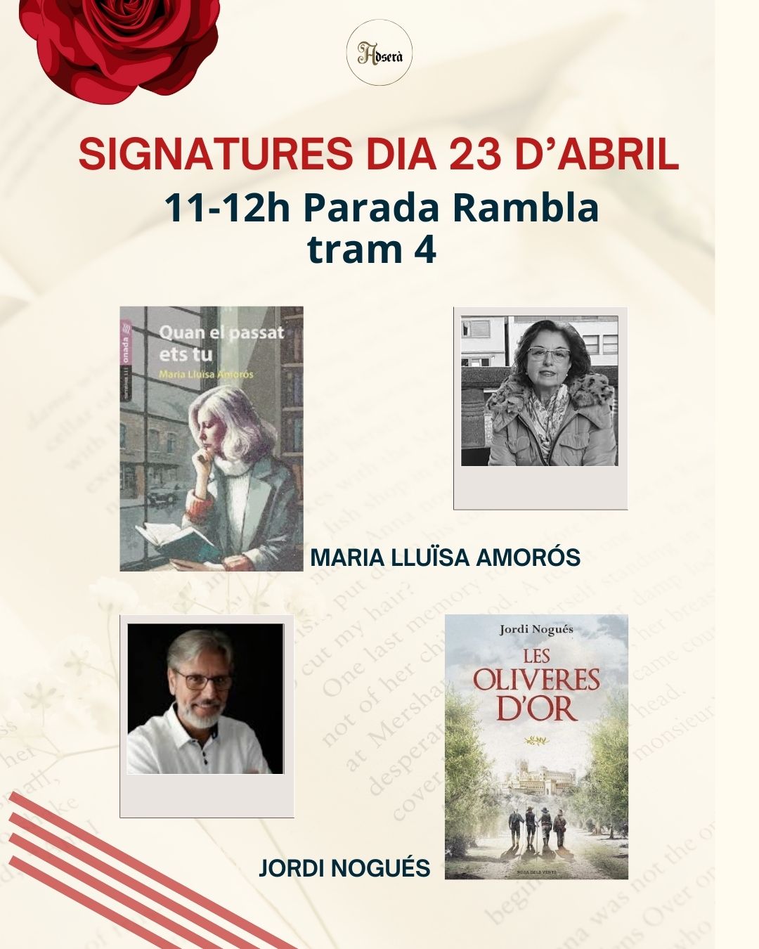 En motiu de la Diada de Sant Jordi, comptarem amb la presència dels autors locals Maria Lluïsa Amorós i Jordi Nogues, a la tradicional parada ubicada a la Rambla Nova, que signaran exemplars dels seus llibres "Quan el passat ets tu" i "Les oliveres d'or".