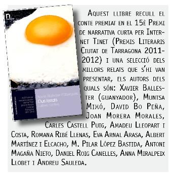 El llibre pertany al 15è Premi de Narrativa curta per Internet "Tinet", que ja es va atorgar dins els Premis Literaris Ciutat de Tarragona 2012. L’acte serà a la llibreria la Rambla a les 20.00 h.