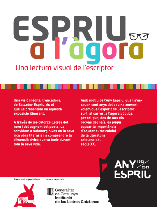 Dins la programació de la Tardor Literària 2013, s’ha organitzat l’exposició itinerant que sota el nom de "Espriu a l’Àgora. Una lectura visual de l’escriptor", s’inaugura dijous 17 d’octubre a les 18 h a la Rambla Nova, davant del Teatre Tarragona, amb la presència de la Tinent d’alcalde de cultura, Begoña Floria i del director dels Serveis Territorials de Cultura de la Generalitat de Catalunya, Jordi Agràs