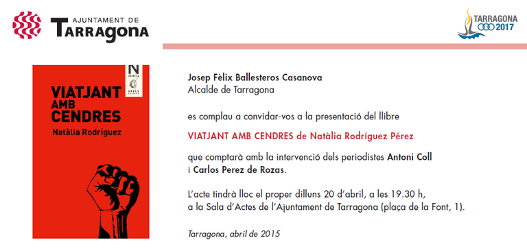 Dilluns dia 20, a les 19.30 hores, a la sala d’actes de l’Ajuntament, es presentarà el llibre “Viatjant amb cendres” de Natàlia Rodriguez Pérez, que comptarà amb les intervencions dels periodistes Antoni Coll i Carlos Perez de Rozas. L’acte estarà presidit pel conseller de Relacions Ciutadanes, Paco Zapater.