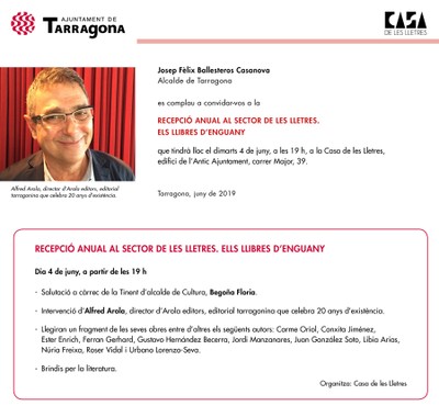 L’acte començarà a les 7 de la tarda. Hi assistirà la consellera en funcions de Cultura, Begoña Floria, i s’iniciarà amb una intervenció d’Alfred Arola, director d’Arola Editors, que aquest 2019 celebra els 20 anys d’existència.