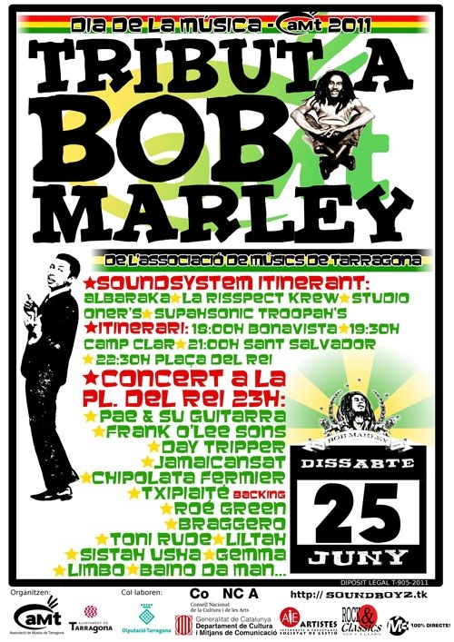 Un total de divuit artistes participaran el pròxim dia 25 de juny en el tribut a Bob Marley organitzat per l’Associació de Músics de Tarragona (aMt). Com ja és habitual els darrers anys, l’aMt celebrarà el Dia de la Música amb un concert de versions, que en aquest cas tindrà com a protagonista el màxim difusor del reggae i la música jamaicana arreu del món, coincidint amb els 30 anys de la seva mort. El concert, com sempre, serà gratuït i tindrà lloc a la plaça del Rei. Però, a més, aquest any, l’aMt porta la música als barris, amb un soundsystem que, al llarg de la tarda del mateix dia 25, recorrerà diversos indrets de la ciutat.