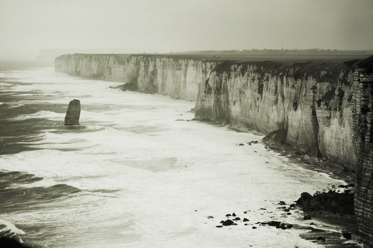 L'idea principal del projecte neix de la voluntat de traduir gràficament la costa salvatge amb aires de fi del món: captar les fortíssimes onades que llepant, apallissant les blanques parets de calcari normandes, el vent que pentina les herbes, el joc dels ocells marins amb les ràfegues...Totes les imatges provenen d'un mateix dia (tempesta del 5 de gener 2012), tret d'una (la foto de l'escultura d'onada), i d'uns mateixos 2.000m de costa situats entre Etretat i Bénouville, tant des de dalts dels penyasegats com a nivell de les algues i de l'escuma salina (en aquest cas, a marea baixa).