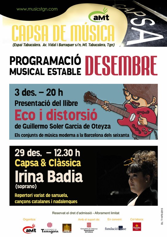 El proper dimarts 3 de desembre, a les 20h, La Capsa de Música acollirà la presentació del llibre "Eco i distorsió. Els conjunts de música moderna a la Barcelona dels seixanta", de Guillermo Soler. L’edició ha estat a càrrec de l’Associació de Músics de Tarragona (aMt), gràcies a una campanya de micromecenatge realitzada fa uns mesos. Després de l’edició de la monografia del grup de rock-folk The Byrds, Guillermo Soler García de Oteyza ens sorprèn amb aquest nou llibre - basat en una vintena d’entrevistes -, indispensable per entendre com a la Barcelona dels anys 60, la irrupció de la música rock va suposar una petita però sorollosa revolució que va configurar una cultura juvenil i una identitat generacional que es contraposaven a la grisa realitat social del moment. Álex y los Findes, Los Catinos, Los Cheyenes, Els Dracs, Los Gatos Negros, Los Go-Go, Los Jóvenes, Lone Star, Los Mustang, Los No, Los Pájaros Locos, Pic-Nic, Los Salvajes, Los Sirex i Els Tres Tambors són els protagonistes d’aquesta recerca que ens apropa també al context en què es van moure, així com la seva significació cultural i social. A la presentació comptarem amb l’autor Guillermo Soler i el músic Joan Reig integrant de Els Pets.