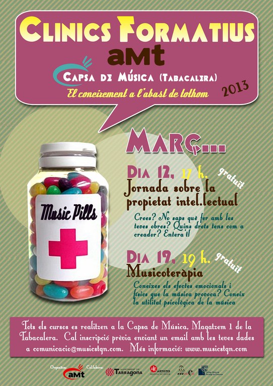 L’Associació de Músics de Tarragona (AMT), amb la col·laboració de la conselleria de Cultura, presenta la vuitena edició dels clínics: 5 propostes formatives al voltant de la música, que es duran a terme al llarg de dos mesos i per primer cop es faran a la Sala Capsa de Música (Magatzem 1 de la Tabacalera). Molts dels clínics són resultat d’intercanvis amb altres entitats, cosa que no només enforteix la xarxa cultural d’una manera transversal, sinó que també ha permès que algun dels cursos sigui d’assistència gratuïta.