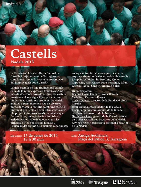 Tarragona acollirà dimecres vinent, 15 de gener, la presentació de Castells, el llibre Nadala 2013 que la Fundació Lluís Carulla publica anualment dedicat a un aspecte de la cultura catalana i que en l’última edició s’ha centrat en el fet casteller, una tradició que ve del passat i que es projecta cap al futur. L’acte de presentació, organitzat entre l’Ajuntament, la Biennal de Castells i la Fundació, tindrà lloc a les 19.30 h a l’Antiga Audiència. Hi participaran la tinent d’alcalde de Cultura, Begoña Floria; el director de la Fundació Lluís Carulla, Carles Duarte; el coordinador de la Nadala, Jordi Llavina i tres dels coautors de l’obra: Josep Bargalló, que a més és comissionat de la Biennal de Castells; Guillermo Soler, gerent de la Coordinadora de Colles Castelleres i Xavier Brotons, periodista casteller.