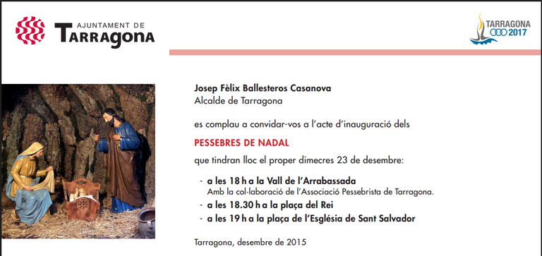 Demà, dimecres, 23 de desembre, l’alcalde Josep Fèlix Ballesteros inaugurarà els tres pessebres de Nadal de la ciutat. El primer serà a les 18 h, al Parc de les Lletres Catalanes (Vall de l’Arrabassada), fet amb la col·laboració de l’Associació Pessebrista de Tarragona; a les 18.30 h el de la plaça de la Rei (centre) i acabarà el recorregut a les 19 h a la plaça de l’Església (Sant Salvador).