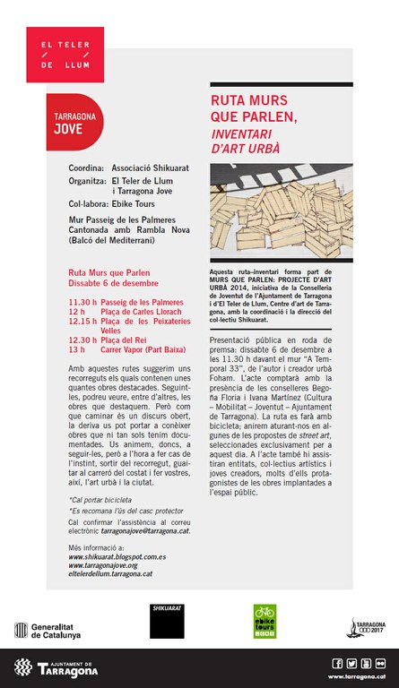 La ruta-inventari, organitzada per l’Associació Shikuarat, El Teler de Llum i Tarragona Jove, prevista per al diumenge passat 30 de novembre i que es va haver de suspendre per la pluja, es farà aquest dissabte 6 de desembre a partir de les 11.30 h, sortint del Passeig de les Palmeres amb la presència de la tinent d’alcalde de Cultura, Begoña Floria.