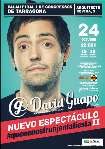 L’humorista David Guapo portarà el seu espectacle #quenonosfrunjanlafiestaII al Palau de Congressos de Tarragona el proper 24 d’octubre. L’espectacle ja té les entrades a la venda per un preu de 15€ (despeses de gestió no incloses) i es poden aconseguir a les botigues Shiva Music de Tarragona i Qui’k de Reus o a través del portal d’internet www.ticketea.com