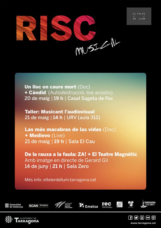 Aquest mes de maig de 2015 torna la programació de “RISC”, la proposta audiovisual del Centre d’Art de Tarragona – El Teler de Llum. I torna amb molt ritme, amb un esdeveniment especial, el RISC Musical. Una proposta que analitza la relació de la música i la imatge en moviment a través de diverses iniciatives. En aquesta ocasió, les connexions entre música i audiovisual es presentaran mitjançant el documental musical, un gènere que els últims anys ha evolucionat passant d'ocupar un nínxol pràcticament comercial fins a registres amb plantejaments artístics i personals. Així, el documental musical, sense perdre el seu vessant popular, s’ha consolidat com a camp de proves per a propostes innovadores.