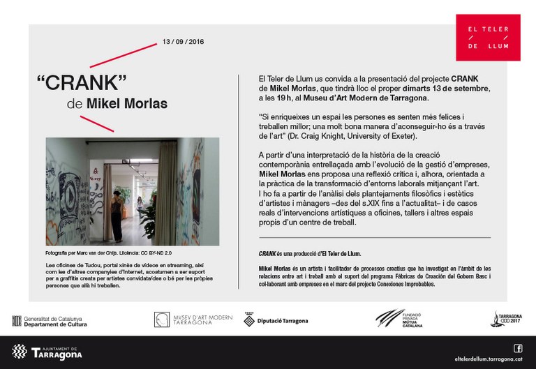 Aquest és el punt de partida de CRANK, el nou projecte impulsat el Centre d'Art de Tarragona - El Teler de Llum a iniciativa de Mikel Morlas, artista i facilitador de processos creatius i d'aprenentatge, qui durant els darrers mesos ha estat investigant els vincles entre les històries i teories de l'art i del management (gestió d'empreses i organitzacions); amb l'objectiu de definir els aspectes a tenir en compte a l'hora d'introduir l'art a un entorn laboral i provocar efectes positius, tant per a les persones com per a les organitzacions, com son el foment de la creativitat, la millora de la comunicació, la compartició de valors i cultura o l'increment de la motivació, entre d'altres que s'han constatat per diversos equips de recerca al voltant d'experiències d'arreu del món.