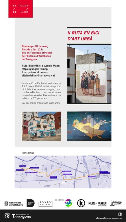 Paral·lelament aquest diumenge podrem participar de la II Ruta en bici d’Art Urbà de la ciutat a través de Murs que Parlen i l’Associació Polígon Cultural. S’ha organitzat una nova sortida per conèixer tot el que s’ha treballat al llarg del darrer any, en alguns casos amb artistes molt reconeguts en l’àmbit internacional, com és el cas d’Edjiin, o com d’altres de caire més antropològic com és el mur de les dones de Bonavista, fet a partir d’una imatge dels anys seixanta real a càrrec de Mariela Ajras. La duració de l’activitat serà entre 2 i 3 hores, sortint a les 11h del matí de l’entrada principal de l’Estació d’Autobusos i recorrent el centre, fins al Serrallo i els barris de Ponent. Caldrà portar la bicicleta de casa. Adjuntem enllaç del Tria33 i enllaç de la ruta a Google Maps.