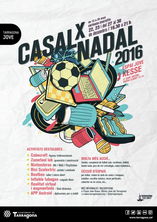 El 22, 23 i del 27 al 30 de desembre el casal de joves municipal ofereix una programació especial per a joves de 12 a 35 anys amb propostes innovadores que poden anar des d’un taller de zometool a un scalextric comandat per un parell de bicicletes estàtiques. La 6a edició del CASAL X NADAL reunirà un conjunt de tallers, aventures i espais de joc algun dels quals són especialment projectats per l’Espai Jove Kesse i dirigit a la població jove de Tarragona.
