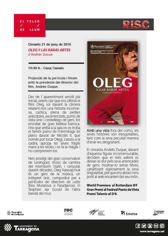 El Teler de Llum juntament amb la programació de cinema del cicle RISC presenten demà dimarts 21 de juny a les 19.30 h a Casa Canals el film Oleg y las raras artes. La projecció anirà seguida d'un fòrum amb el seu director, Andrés Duque.