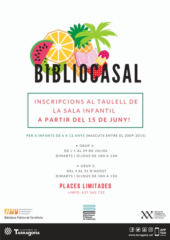 El dia 15 de juny, a partir de les 10 h del matí, es van obrir les inscripcions del Bibliocasal, de manera presencial. S’han creat dos grups de 10 infants de 6 a 12 anys (nascuts entre el 2009 i el 2015). Un grup participarà del Bibliocasal els dimarts i dijous, de l'1 al 29 de juliol i l'altre grup ho farà els dimarts i dijous, del 3 al 31 d'agost. Les places del juliol s’han esgotat en menys de 24 hores i pel Bibliocasal de l’agost encara queden algunes places lliures.