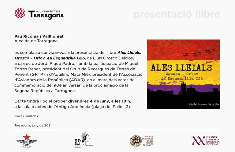 Demà divendres 4 de juny a les 19 h, l’Antiga Audiència acull la presentació del llibre Ales Lleials. Orozco – Orlov. 4a Esquadrilla G26, de Lluís Orozco Delclós. La presentació anirà a càrrec de Jordi Piqué Padró, director tècnic de la Comissió de Programes de Memòria de l’Ajuntament i estarà presidida per l’acalde de Tarragona, Pau Ricomà. Durant l’esdeveniment intervindran l’autor del llibre, Lluís Orozco, Miquel Torres Benet, president del Grup de Recerques de Terres de Ponent (GRTP), i Aquilino Mata Mier, president de l’Associació d’Aviadors de la República (ADAR).