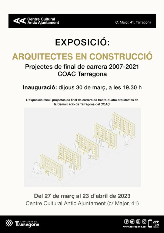 Del 27 de març al 23 d'abril, el Centre Cultural Antic Ajuntament l'exposició "Arquitectes en construcció", una mostra dels projectes de final de carrera de 34 arquitectes de la demarcació de Tarragona del Col·legi Oficial d’Arquitectes de Catalunya. L’acte de presentació de l’exposició se celebrarà dijous 30 de març a les 19 h i comptarà amb un debat reflexiu sobre l’arquitectura de la ciutat.